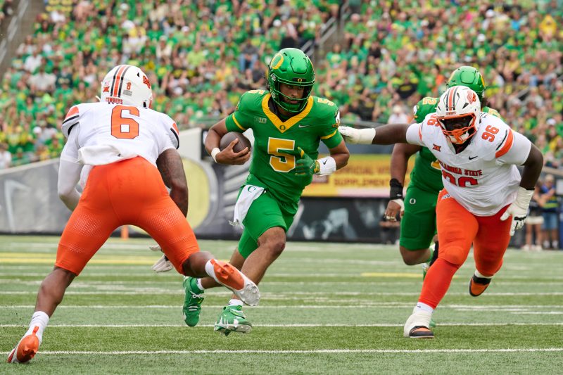 The Big Ten features the week’s marquee contest as No. 2 Oregon hosts No. 7 Indiana. Elsewhere in the league, top-ranked Ohio State hits the road at No. 17 Illinois, No. 15 Michigan heads west to take on Southern California, and No. 22 Penn State looks to get right against Northwestern.