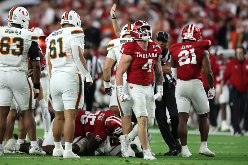 Kicker Carter Davis’s 49-yard attempt with 33 seconds left in the half had the distance but drifted right and clanged off the goalpost to send the Hoosiers into the break ahead 10-0. IU went into the locker room with a 100-yard edge in total offense (169-69) and 11 first downs to Miami’s three. The Hurricanes were 0 of 6 on third down.