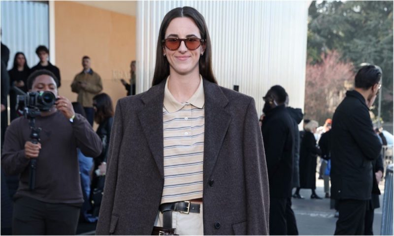 During her appearance at Milan Fashion Week, she sat front row with Olympic skier Eileen Gu, as the pair took in the sights. True to form, Clark was wearing a Prada belt with her pants and a cropped polo. She finished the look with an oversized coat, brown heels and a small bag.
